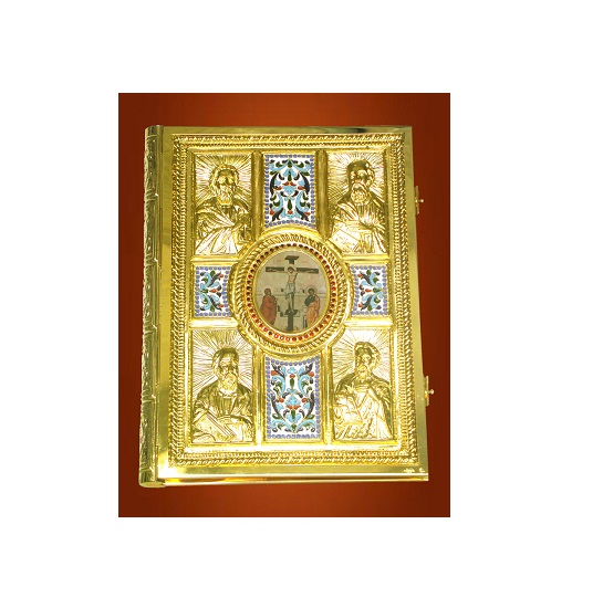 Evanghelia se afla pe Sfanta Masa si simbolizeaza pe Insusi Mantuitorul care a luminat Lumea cu invatatura Sa. Cuprinde cele 4 evanghelii: Matei, Marcu, Luca si Ioan este imbracata in chip deosebit, in coperti argintate sau aurite, impodobita cu emailuri, avand in centru icoana Invierii, in colturi icoanele evanghelistilor iar pe spate icoana Rastignirii. In cadrul obiectelor religioase, Sfanta Evanghelie ocupa un loc extrem de important. Evanghelie aurita cu email, text in lb. romana inclus, dimensiuni: 27,5 cm x 37 cm..