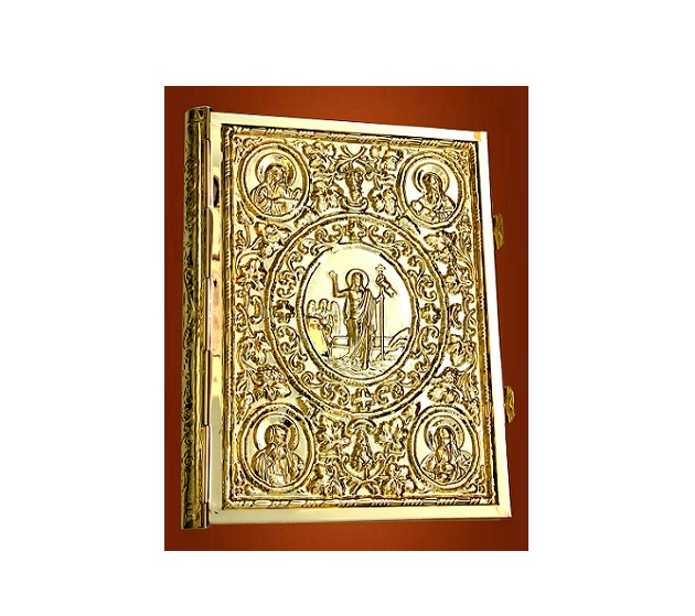 Evanghelia se afla pe Sfanta Masa si simbolizeaza pe Insusi Mantuitorul care a luminat Lumea cu invatatura Sa. Cuprinde cele 4 evanghelii: Matei, Marcu, Luca si Ioan este imbracata in chip deosebit, in coperti argintate sau aurite, impodobita cu emailuri, avand in centru icoana Invierii, in colturi icoanele evanghelistilor iar pe spate icoana Rastignirii. In cadrul obiectelor religioase, Sfanta Evanghelie ocupa un loc extrem de important. Evanghelie aurita in relief, cu dimensiunile: 26 cm x 36 cm.