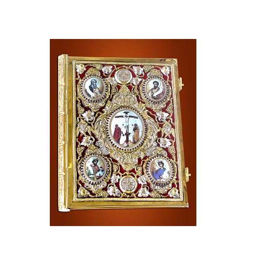 Evanghelia se afla pe Sfanta Masa si simbolizeaza pe Insusi Mantuitorul care a luminat Lumea cu invatatura Sa. Cuprinde cele 4 evanghelii: Matei, Marcu, Luca si Ioan este imbracata in chip deosebit, in coperti argintate sau aurite, impodobita cu emailuri, avand in centru icoana Invierii, in colturi icoanele evanghelistilor iar pe spate icoana Rastignirii. In cadrul obiectelor religioase, Sfanta Evanghelie ocupa un loc extrem de important. Evanghelie de catifea, alb cu galben si pietricele, text in limba romana inclus.