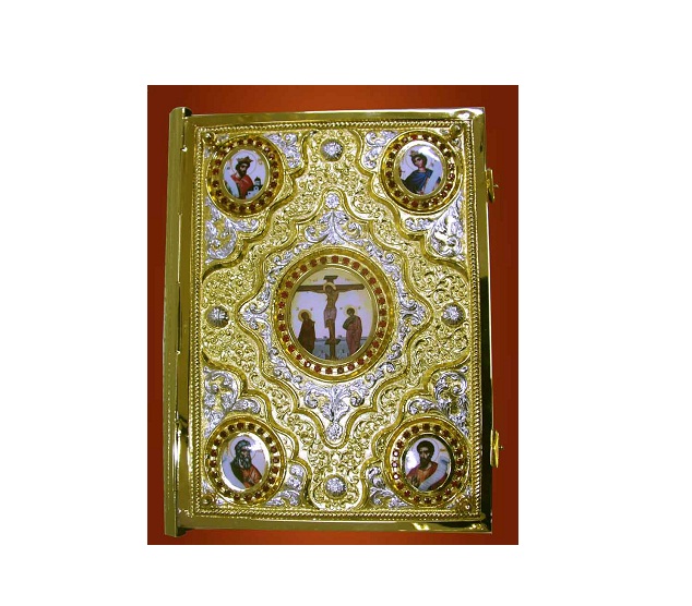 Evanghelia se afla pe Sfanta Masa si simbolizeaza pe Insusi Mantuitorul care a luminat Lumea cu invatatura Sa. Cuprinde cele 4 evanghelii: Matei, Marcu, Luca si Ioan este imbracata in chip deosebit, in coperti argintate sau aurite, impodobita cu emailuri, avand in centru icoana Invierii, in colturi icoanele evanghelistilor iar pe spate icoana Rastignirii. In cadrul obiectelor religioase, Sfanta Evanghelie ocupa un loc extrem de important. Evanghelie aurita si argintata, iconite si pietre semipretioase. Dimensiuni: 27 cm x 34 cm. Text in limba romana inclus.